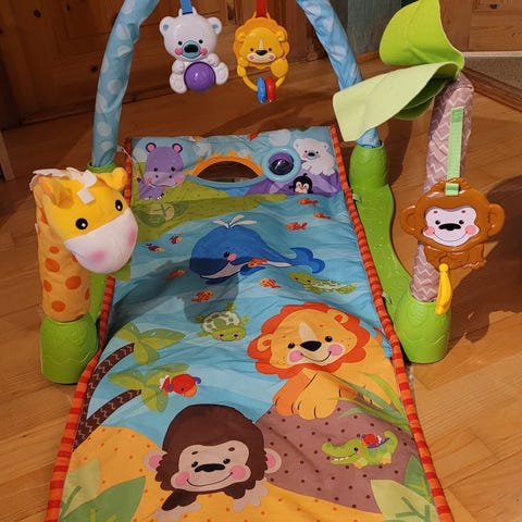 Fisher-Price lekematte for barn med fargerike dyr og mønstre. Laget for å stimulere barns sanser og motoriske ferdigheter gjennom lek. Passer for små barn og kan brukes som underlag for lek og aktivitet.