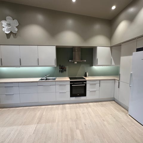 Flott og solid, slitesterkt og tidløst kjøkken fra 2005, som er like fint og funksjonelt. Noen bruksmerker på et par av benkeskap-dørene etter håndtak som har vært dunket borti, og litt slitasje på underkant på endeplaten, se bilder.