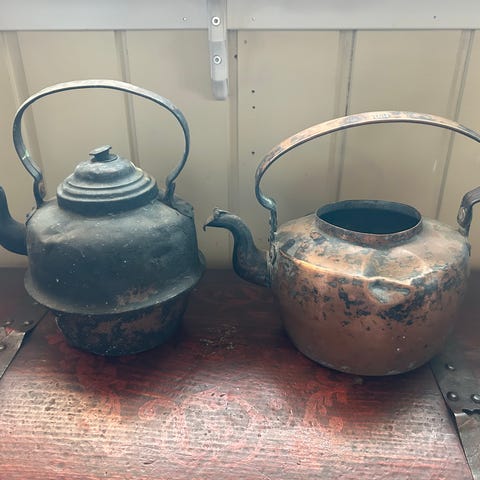 3 kjeler, den store er produsert på Vølund på Hamar og er type nr 5 som visstnok er ganske sjelden. Den står også på en egen annonse i tillegg. 2 mindre konberkjeler, noen bulker på kjelene, men ellers fine. Det store fatet i kobber er også meget pent.