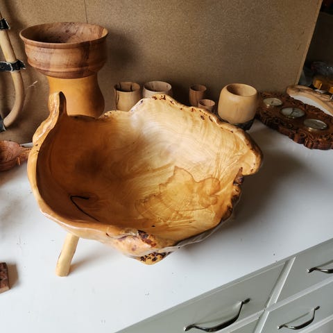 Samling diverse dreide trearbeider samt noen slengere, laget av ulike tresorter (syrnet bjørk, bøk, furu, div hardwood++). Se bilder for tilstand. k120