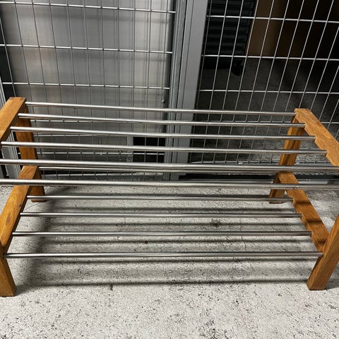 Metall skohylle i grå farge. Hyllen har flere parallelle stenger som gir god lufting rundt skoene. Egnet for plassering i gang, entre eller bod for organisering og oppbevaring av sko. Stabil konstruksjon i metall som tåler daglig bruk.