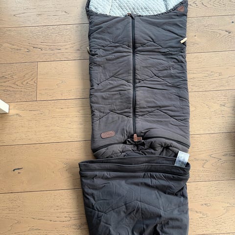 Pent brukt vognpose med dun. Varm og god om vinteren. Forlengerdel, hvitt fleece-hodeunderlag og oppbevaringspose medfølger. Vognposen er nyvasket.
