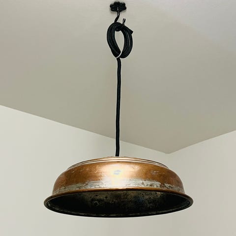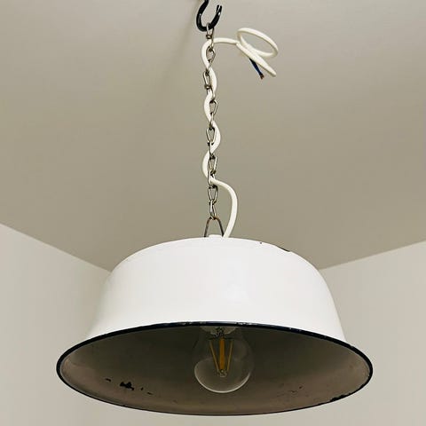 Stor og stilren takpendel i hvitlakkert metall. Klassisk form som passer perfekt over spisebord eller kjøkkenbord og gir et fint, behagelig lys. Lampeskjermen er vasket, men kan gjerne få en ekstra runde nederst langs kanten. Den har også noen bruksmerker/lett slitasje (se bilder). Merket “170° ledning skal anvendes” (varmebestandig ledning). Ujordet.