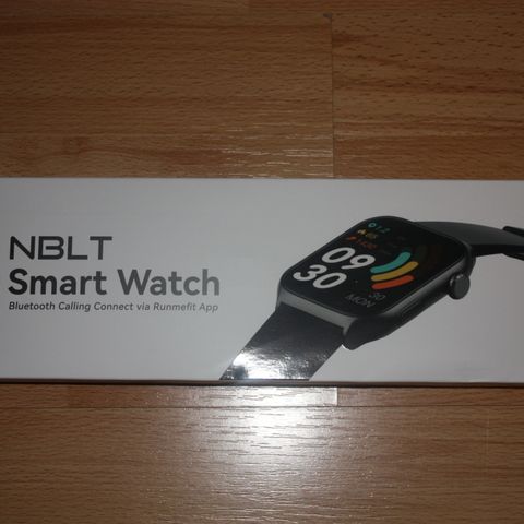 NBLT Smart Watch smartklokke med svart reim. Klokken har funksjoner som Bluetooth-tilkobling og støtte for Runmelt-appen. Designet for generell bruk.