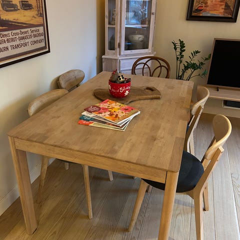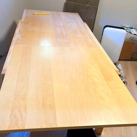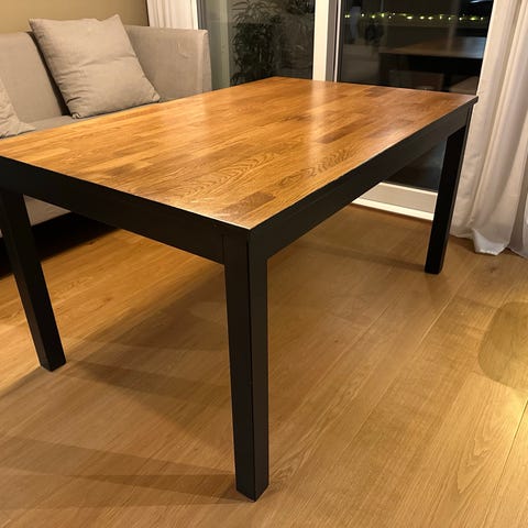 Godt brukt spisebord selges. Uten ileggsplater: 2 meter. De to ileggsplatene er 45 cm hver. Stålben og eikefiner. Selv om det er synlig brukt så har det mange fine år igjen! Ekstraplatene kan enkelt monteres av og på ettersom behov for lengde.