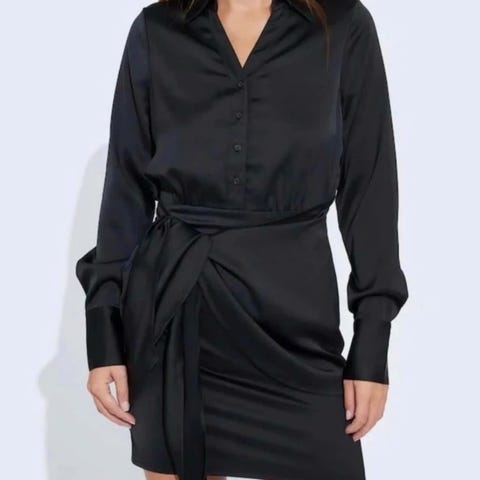 Bik Bok hverdagskjole i svart polyester, størrelse S. Kjolen har en enkel og funksjonell design med knapper foran og belte i livet. Egnet for hverdagsbruk.