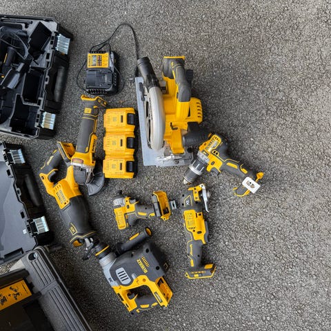 DeWalt batteridrevet verktøysett med flere håndverktøy, inkludert 3 stk skrumaskiner, sirkelsag, bajonettsag, med 5 batterier og 2 ladere.