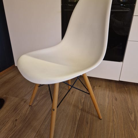 Stolen er solid, stabil og fullt funksjonell, men har synlig slitasje i setet (sprekker i kunstskinn) – se bilder.