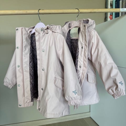 Tynn boblejakke fra name it. Mørk rosa. Har fått lappet noen hull med svart lappeteip. Dette holder bra. Har også en anmerkning ved haken som er sydd - noe ødelagt i glidelåsen øverst, så den øverste centimeteren kan ikke lukkes.