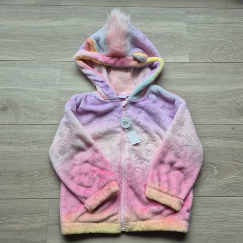 Lett foret lilla enhjørningsjakke fra Lindex. Vannavstøtende. Enhjørning på lommene. Denne har fått løvetannsflekker på seg som ikke går bort (fremme). Også skrape på en knapp. Perfekt til våren.