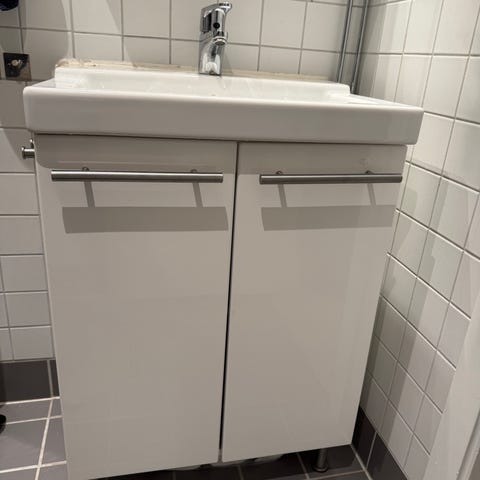 Vannskade nederst. Planen var å sage av nederste skap for å ha det i bod. Hengsler, dører og skuff er ok.