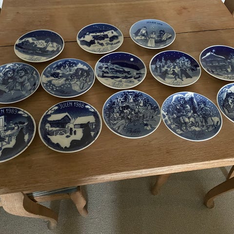 Første sett har tallerkener fra 1974-1978, samt 1980, 6 tallerkener totalt. Settet selges for 600kr.