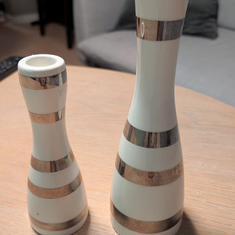 Mangler en av av grønnstripete lysestaker for at du skal ha et par? 16 cm høyt. Lite skår langs kanten nederst. Litt slitt rundt der lyset står, men synes knapt syns jeg når lys er i den.