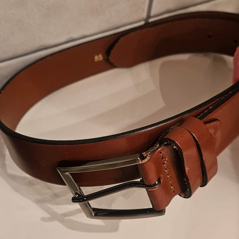 Lindeberg foret belte for unisex i lilla farge. Beltet har en metallspenne med et geometrisk design. 108 cm langt og 4 cm bredt.