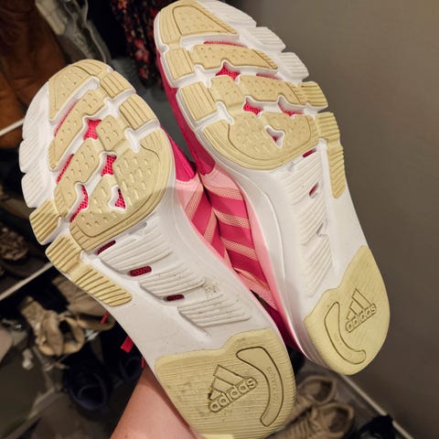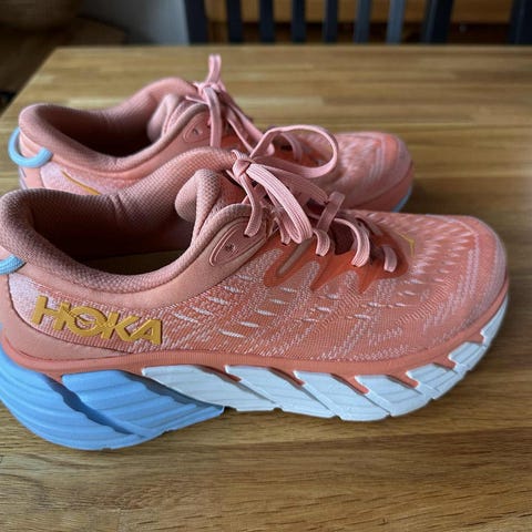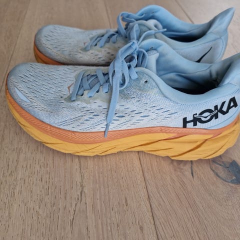 Hoka sko, størrelse 40. Skoene er designet for løping og har mesh-materiale for ventilasjon. Skoene er fine på utsiden, men slitt på innsiden av hælen. Dette kan sikkert fikses om man kjøper hælkappe eller lignende.