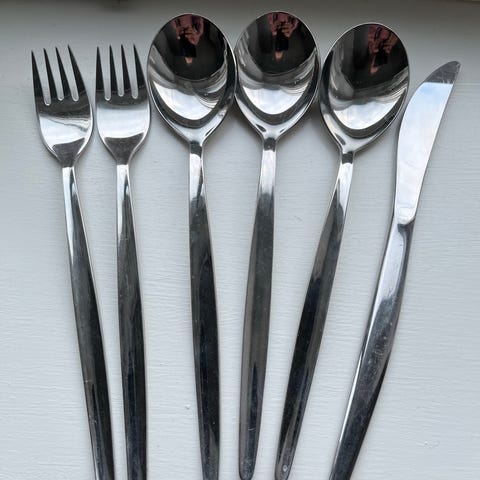 Kniv, gaffel, skje, bestikk, barnekniv, barnegaffel, barneskje, kakegaffel, mokkaskje, sausøse.