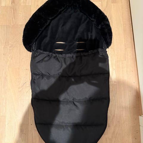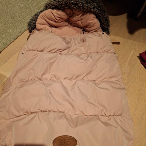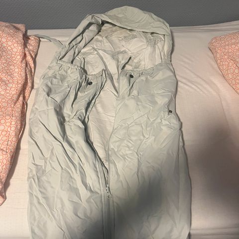 Sovepose i blå og grønn farge med mønster på innsiden. Passer til bruk ved utendørs overnatting.