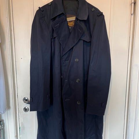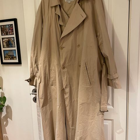 Vintage trenchcoat. Det ser ut som den hadde et avtakbart fôr, noe som gjorde den varmere. Kåpen er veldig stilig og fin. Har belte og lommer. Selv om det står at det er en herrefrakk, fungerer den helt fint for damer også. Kan betraktes som en unisex trenchcoat.