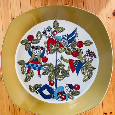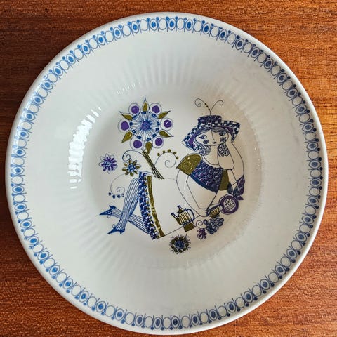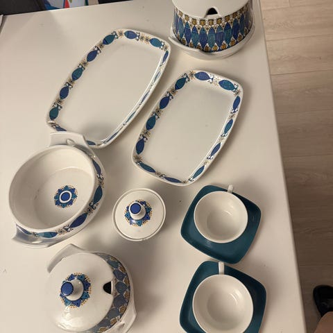 Settet består av et stort serveringsfat, et lite serveringsfat med kant og håndtak, to terriner (en stor og en liten) med lokk, tre skåler, to fat (19cm i diameter) og 5 små fat. Settet er i svært god stand og har ingen synlige skader.