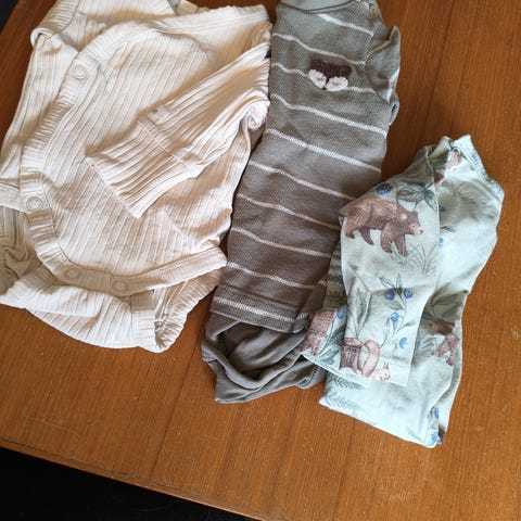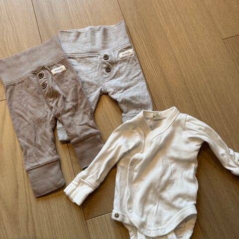 Newbie barnesett for barn i størrelse 50, unisex. Settet består av to langermede bodyer med forskjellige mønstre i brune toner, samt et par brune bukser. Materialet er ikke spesifisert. Passer for nyfødte barn.
