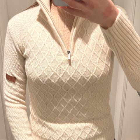 Twentyfour høyhalset genser i størrelse XL for dame. Genseren er hvit og laget av ull. Den har en høy hals og stripete detaljer på ermene.