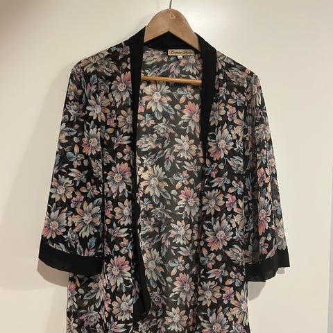 Selger en nydelig, unik kimono i fløyelsmykt stoff og med detaljerte blomsterbroderier. Kimonoen fremstår som av høy kvalitet og kan brukes til mange ulike anledninger.