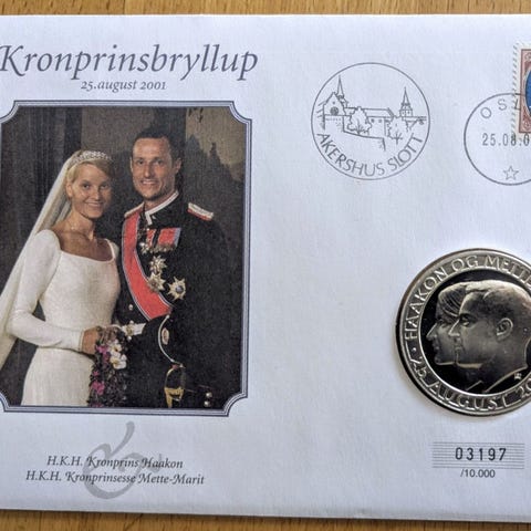 Kronprinsbryllup minneark med frimerke og mynt