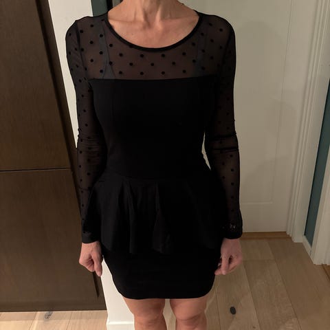 Mango festkjole i størrelse S, svart farge og laget av polyester. Kjolen har tynne stropper og fjærdetaljer nederst.