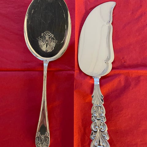 Solide, tunge håndtak i ekte tinn og resten i rustfritt stål. Selges samlet.
