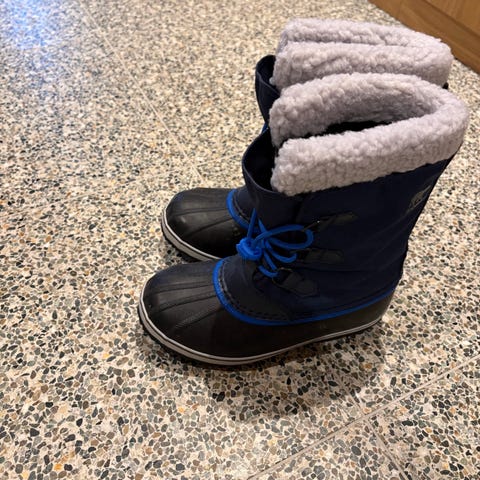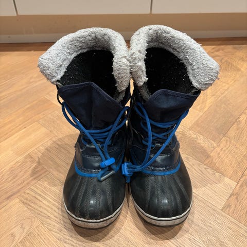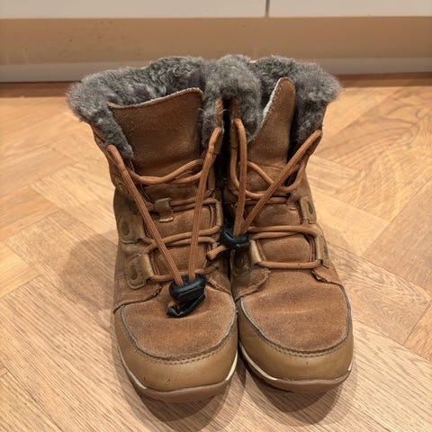 Sorel barne vintersko i størrelse 35, unisex. Skoene har en brun farge med snøring og fôret med mykt, varmt materiale for isolasjon. Yttersålen har godt grep, egnet for kalde og våte forhold.