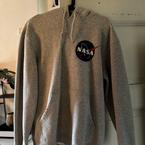 H&M NASA hettegenser i størrelse S for menn. Genseren er grå og laget av bomull. Den har hette og frontlomme, med NASA-logo på brystet.