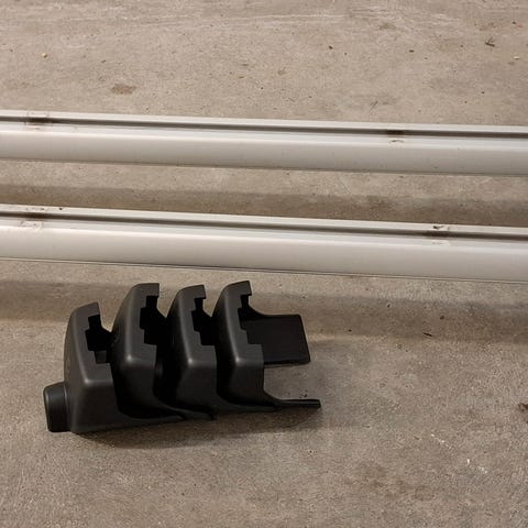 Volkswagen Basisstativ takstativ med tilbehør for montering på taket av bil. Inkluderer fire monteringsfester og monteringsanvisning. Farge sølv og svart, laget for å transportere ekstra last på taket.
