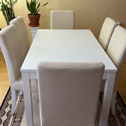 Lyst, romslig, men nett spisebord med 6 hvite stoler selges sammen eller hver for seg.
