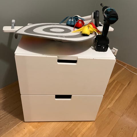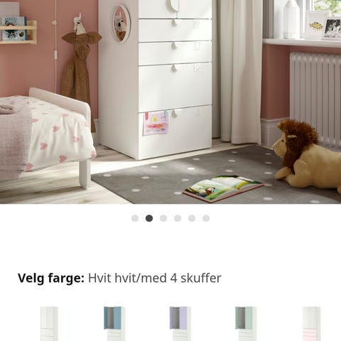 2 stk småstad skap selges samlet for 800kr. Det er noen klistremerker på en dør og sidene på skapene. De sorte skuffene kan man bruke kritt på. To skruehull på siden av det rosa skapet, ett på hver side.