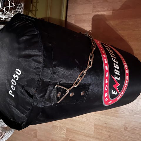 Everlast boksesekk med tilhørende boksehansker og opphengskjede. Boksesekken er designet for trening og kampsport, hanskene er hvite med svart logo og borrelås. Opphengskjeden følger med for enkel montering. NB: Sender ikke. Må hentes.