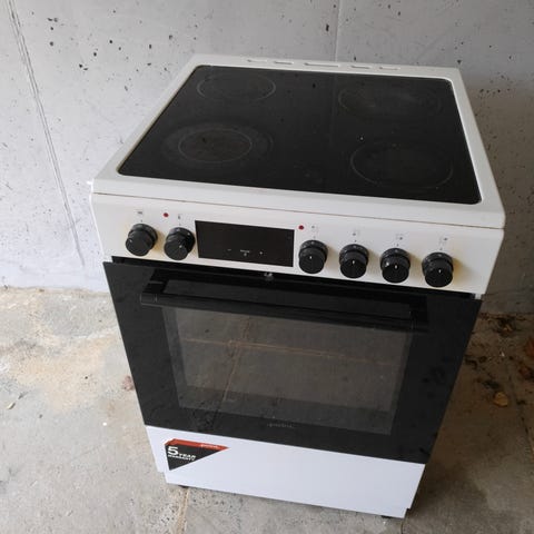 Electrolux keramisk komfyr med keramisk kokeplate. Komfyren har hvit farge og tradisjonelle knotter for betjening. Egnet for matlaging med keramisk varmeelement. Den heter Electrolux Intuition