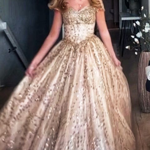 Leier ut denne nydelige ballkjolen, fra Lychinor. Fargen er superflott - fremstår enda finere i virkeligheten. Nummeret på kjolen er L2753T - rosa / rosegull / gull i fargen.