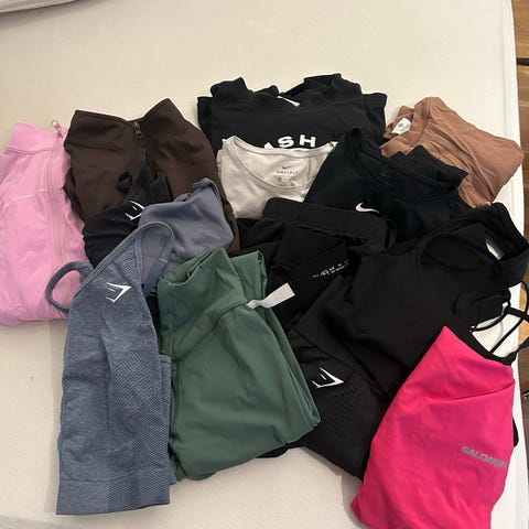 treningsklær for dame i størrelse XS, inkluderer 3 tightser fra gymshark, en longsleeve fra gymshark og en tskjorte og sportsbh fra ukjent merke. Pent brukt. Selges samlet for 250kr