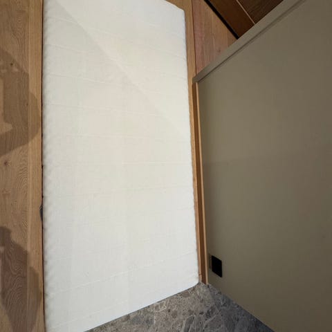 Veldig lite brukt. En svak liten flekk omtrent midt på madrassen. Trekket kan tas av og vaskes. Ellers - så god som ny!