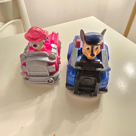 Uåpnet Paw Patrol Chase Patrol Cruiser med mer. Det grønne Thomas-toget kan trekkes opp og kjøre selv ved å dra ut vognen (Tomy 1998). Kranbilen kan gis ekstra fart. Alt er i fin stand, selges samlet.