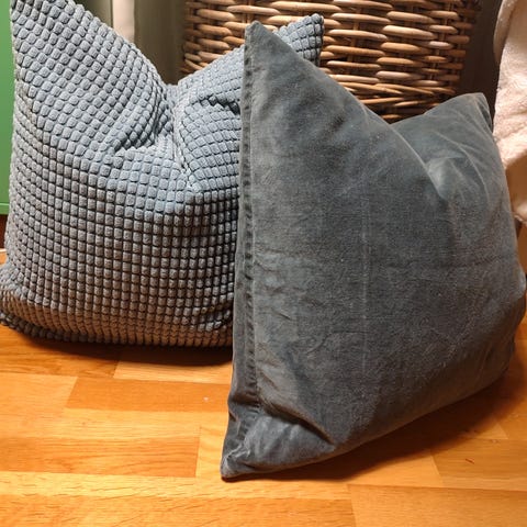 Rydder i huset, 🏡.Er i ryddemodus så kommer stadig noen " godbiter" på finn 😀 Disse putene har jeg hatt bare på pynt på et gjesterom🤗Rene og pene👍,. Om sommeren vært på benken på terassen. Flotte , følger med innerputene i myk dun. Må hentes.( Se gjerne mine andre annonser) 😀