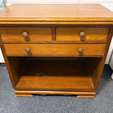 Gammelt skap. Selges. Skapet har hyller på ene siden og skuffer på den andre.
