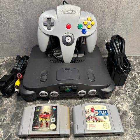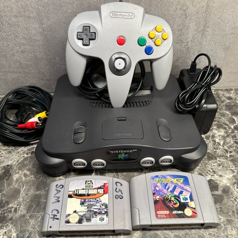 N64 konsoll med kontroll, strømforsyning, nytt HDMI adapter og 1080 Snowboarding