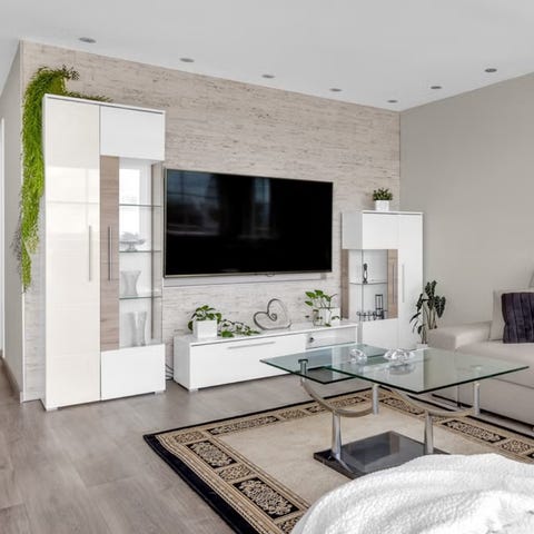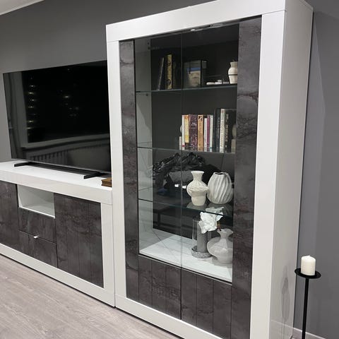 Selger en elegant og funksjonell TV-seksjon i moderne design, brukt i noen år, men fortsatt i svært god kvalitet. Møblene er solide, romslige og gir et eksklusivt uttrykk i stuen – spesielt takket være integrert LED-belysning i vitrinene med glasshyller.