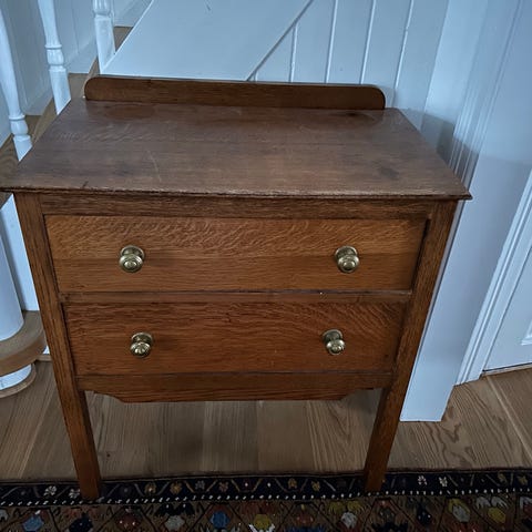 Nydelig kommode med fire skuffer og er laget av tre med mørk finish og har nøkkelhull til hver skuffe.