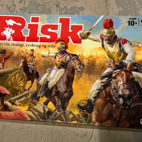 Parker Risk brettspill med spillbrikker, terninger og kort. Spillet er designet for flere spillere og går ut på å erobre verdenskartet. Inneholder spillbrett, regler og spillkomponenter.