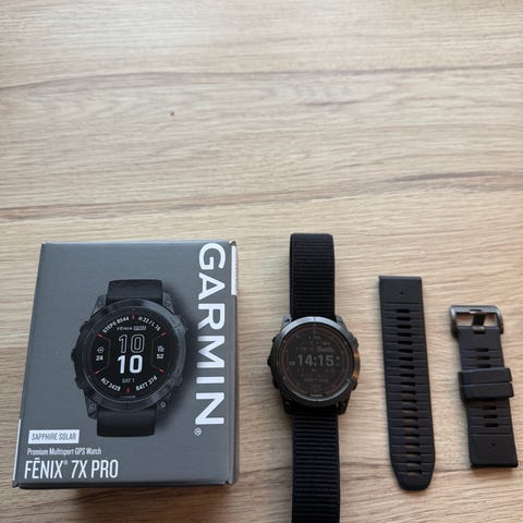 Garmin Fenix 7X smartklokke med svart reim. Klokken har en robust design og er utstyrt med avanserte funksjoner for sport og friluftsliv. Den har en stor skjerm med tydelig visning av tid og data, samt innebygde sensorer for helse- og treningsmåling.