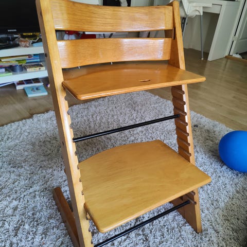 Stokke Tripp Trapp barnestol i mørkt tre selges for 600kr, pent brukt.