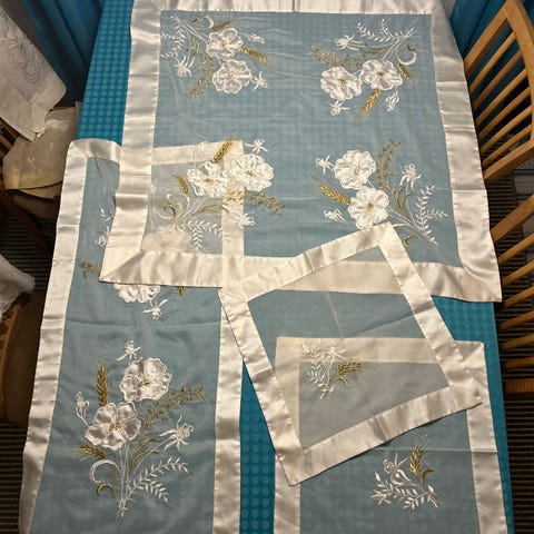 4 stk duker i forskjellig størrelser på offwhite bunn med broderi i gull, rustrødt, grønn og flere. Helt nye og ingen skader.