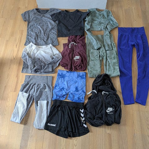 Pakke med klær. Nike fitness shorts for dame i størrelse S. Inkluderer svart shorts, en beige topp og en svart og grå genser. Alle klærne er nesten ikke brukt og derfor selges de :) pris kan diskuteres :) kom med bud